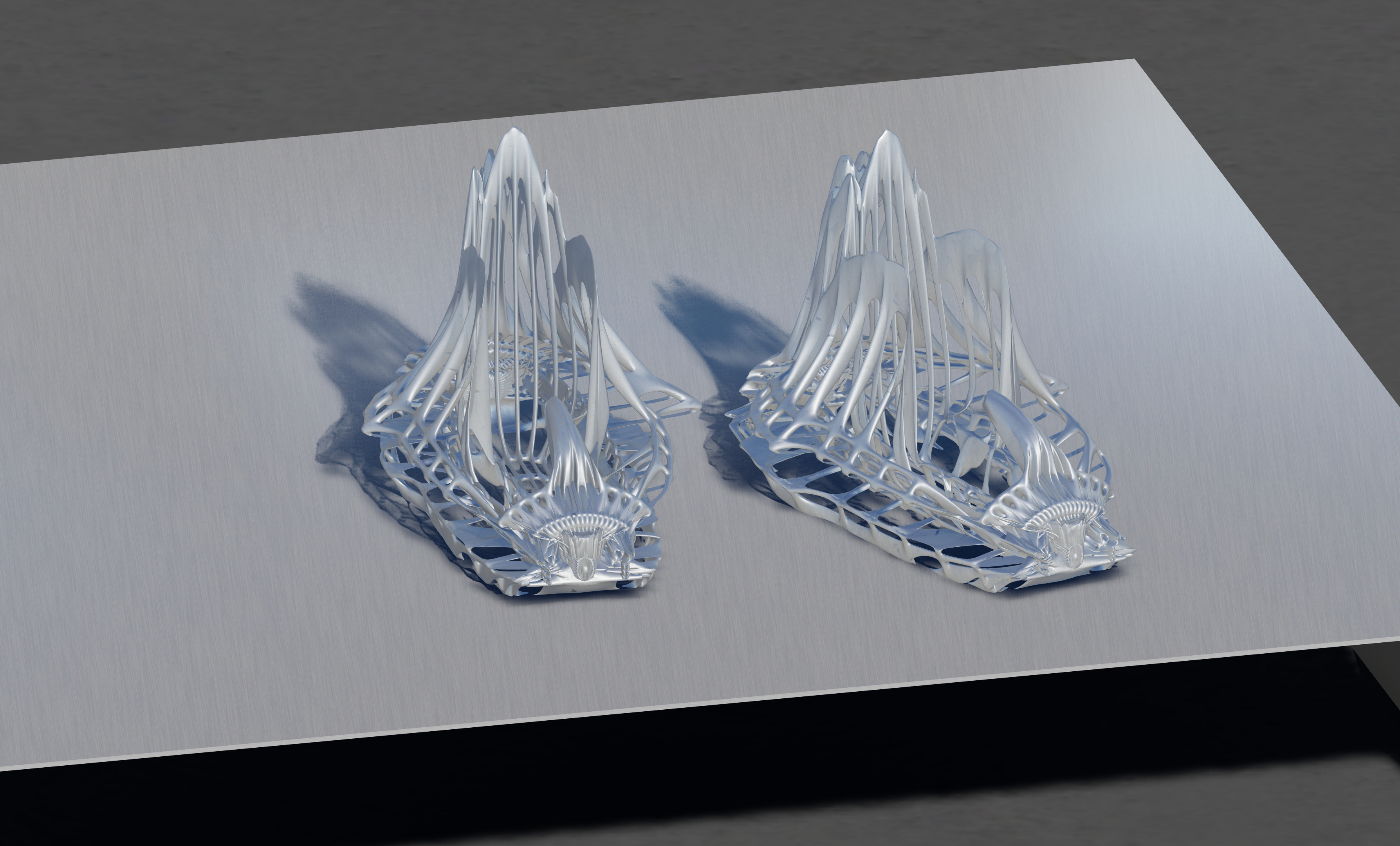 The organic shoe design is a cover for traditional footwear. It comes in metallic, wood, white, and black finishes.